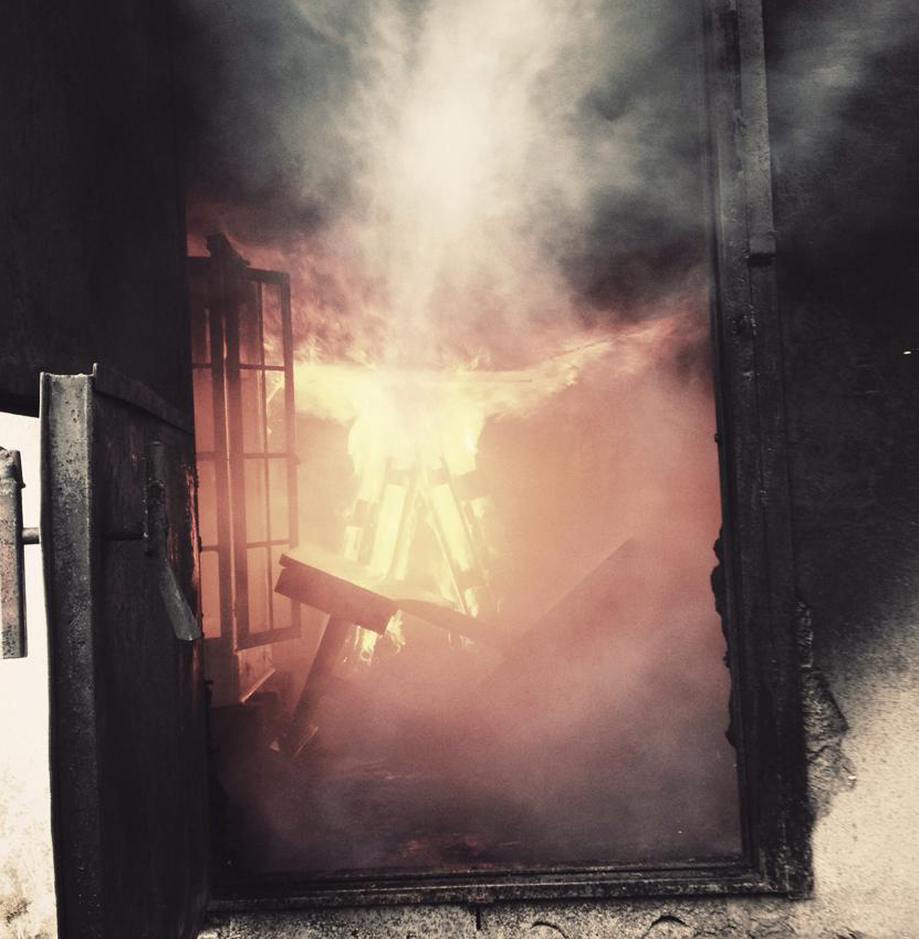 For å få scenografi til en skrekkfilm-scene fikk vi hjelp av brannvesenet og brente møbler og rekvisitta.
